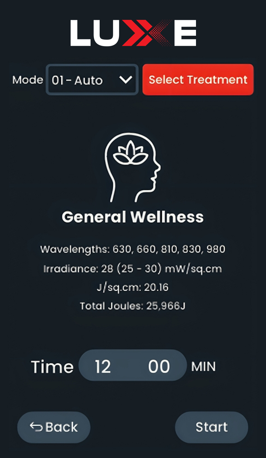 The same Mode-1 protocols (and Wellness Preview, where available) at higher doses—tuned for deeper skin tones (Fitzpatrick IV–VI) or stronger treatments, while staying within Luxxe’s safety envelope.