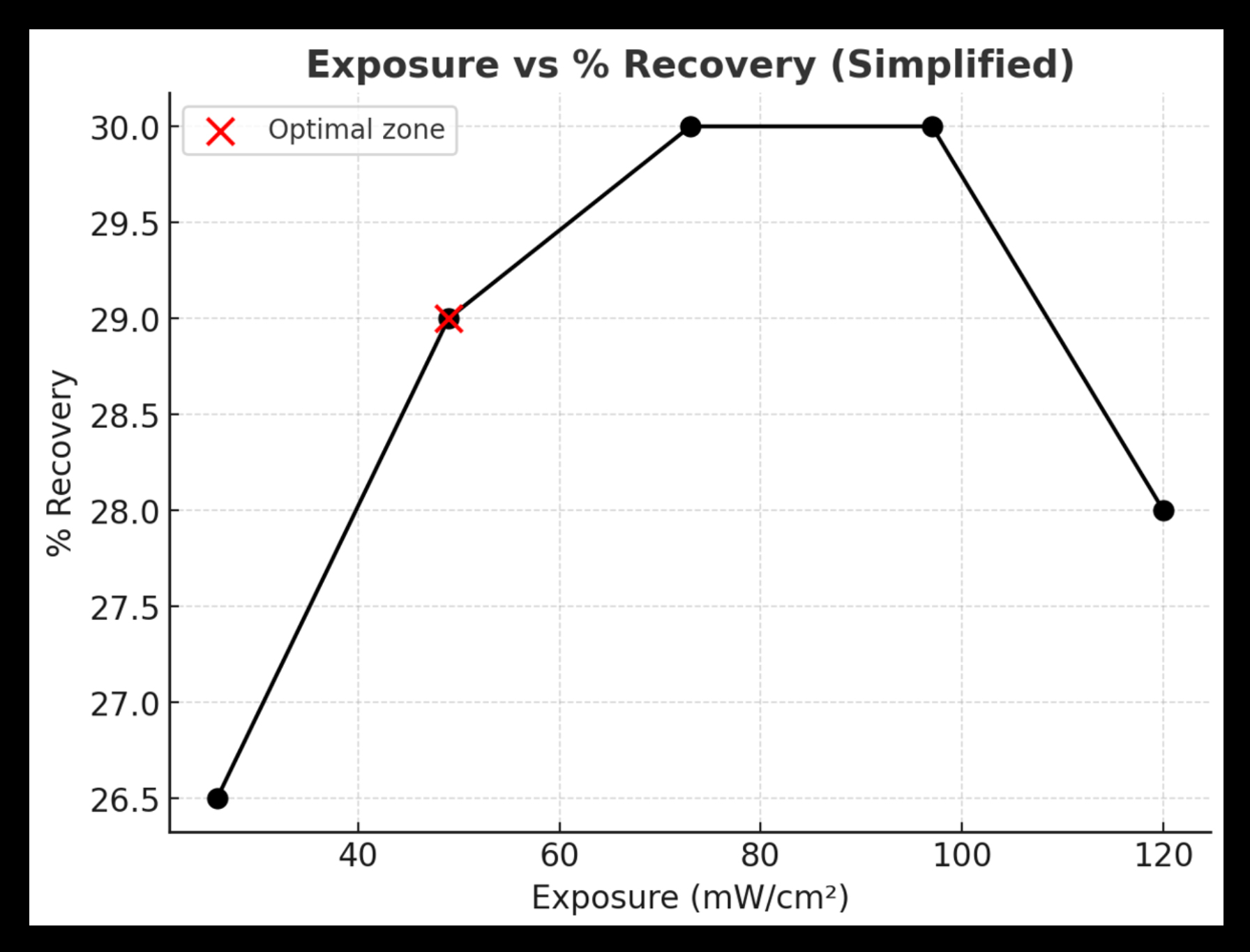 In the chart above, we clearly see that the greatest percent of recovery improvement occurred midway at the 49 milli watt per square centimeter (mW/cm^2) level and not at the highest intensity of 120 mW/cm^2.