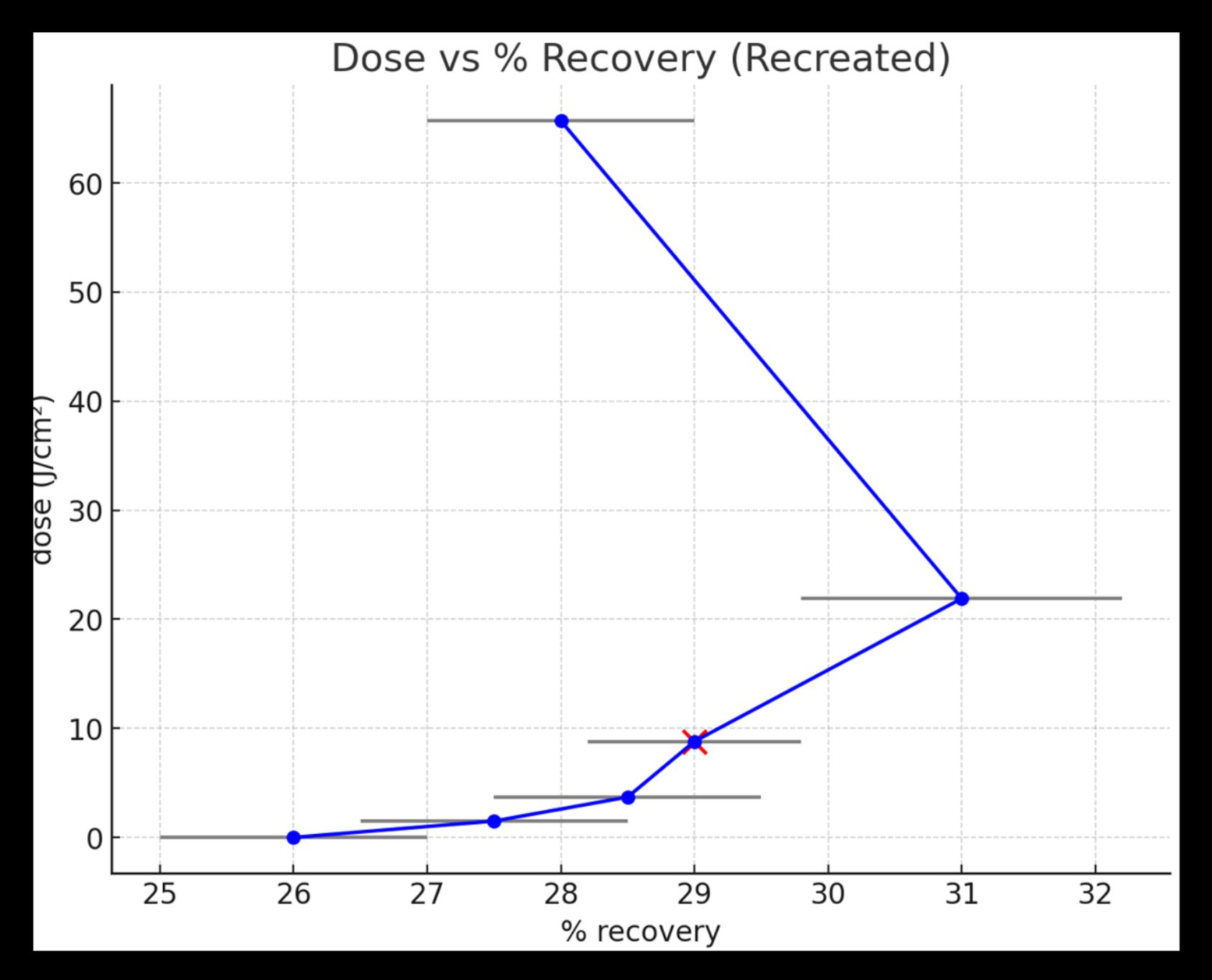 Also, notice the dose chart below shows the corresponding energy density of 8.8 Joules per square centimeter (J / cm^2), which was closer to the lower end of the dose range rather than to the higher end of the dose range, produced the greatest amount of recovery in the test subjects.